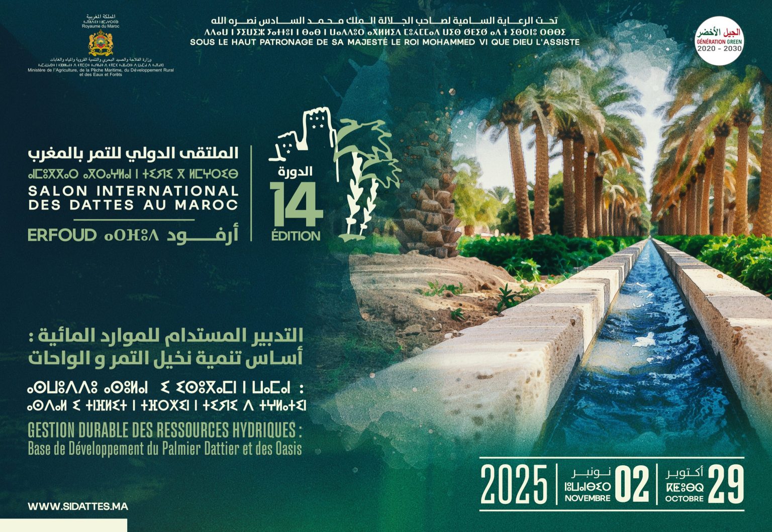 تحت الرعاية السامية لصاحب الجلالة الملك محمد السادس، نصره الله، تحتضن مدينة أرفود فعاليات الدورة الرابعة عشرة من الملتقى الدولي للتمر بالمغرب، من 29 أكتوبر إلى 2 نونبر 2025، تحت شعار “التدبير المستدام للموارد المائية: أساس تنمية نخيل التمر والواحات”.