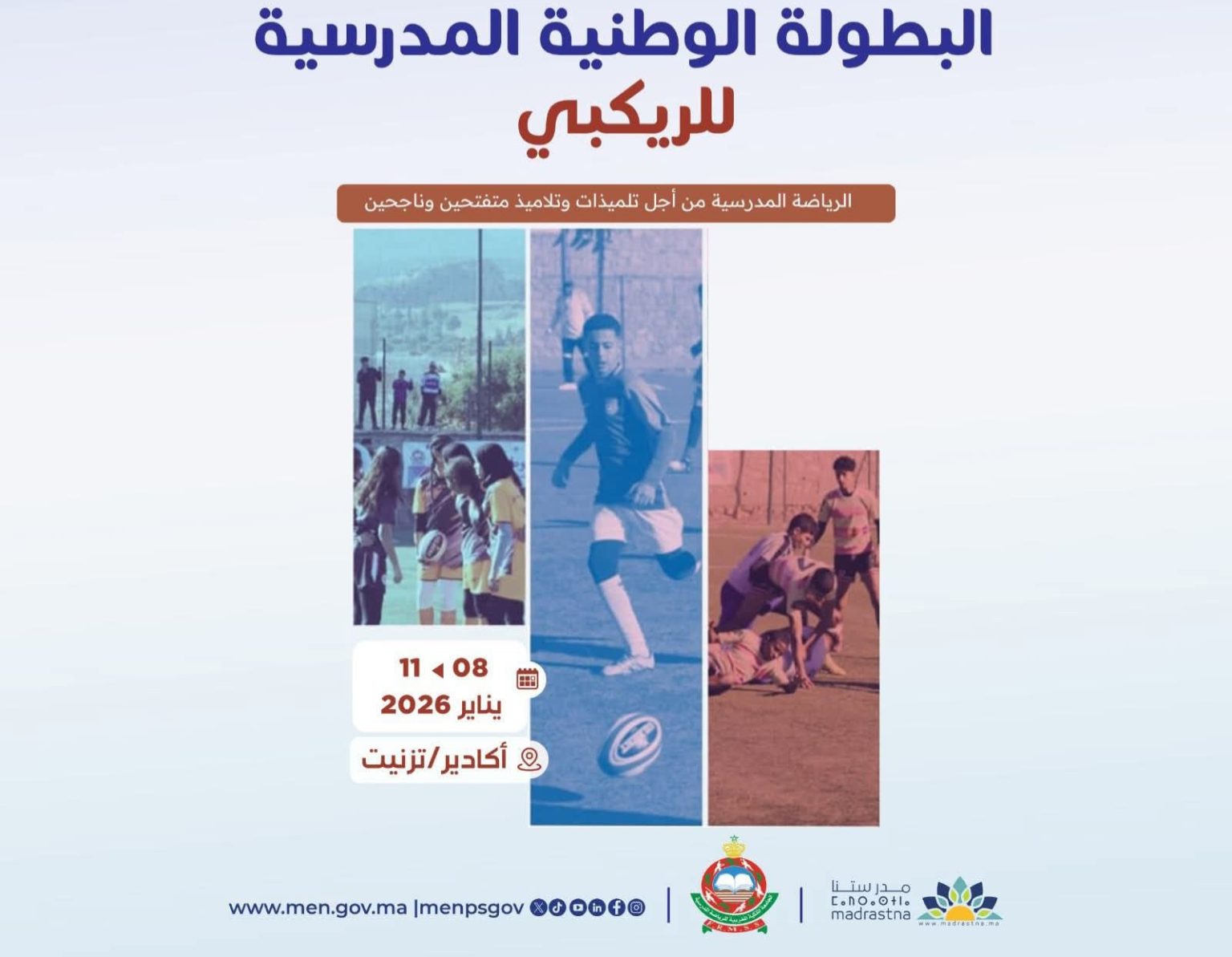 في إطار تفعيل مضامين خارطة الطريق 2022-2026، وتنفيذ استراتيجية الوزارة الرامية إلى الارتقاء بالرياضة المدرسية، تنظم مديرية الارتقاء بالرياضة المدرسية لوزارة التربية الوطنية والتعليم الأولي والرياضة بشراكة مع الجامعة الملكية المغربية للرياضة المدرسية، وبتنسيق مع الأكاديمية الجهوية للتربية والتكوين لجهة سوس ماسة، البطولة الوطنية المدرسية للريگبي بمدينة أكادير، خلال الفترة الممتدة من 8 إلى 11 يناير 2026.