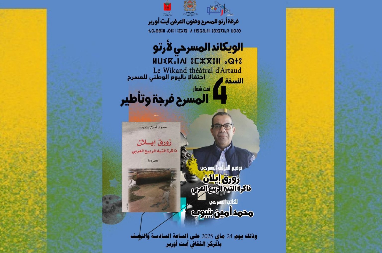 تشهد فعاليات الدورة الرابعة من الويكاند المسرحي لأرتو، الذي تنظمه فرقة أرتو للمسرح وفنون العرض بأيت أورير، من 23 إلى 25 ماي 2025، تحت شعار “المسرحة فرجة وتأطير”، حفل توقيع كتاب المسرحية “زورق إيلان، ذاكرة التيه العربي” للكاتب والمخرج المسرحي محمد أمين بنيوب.