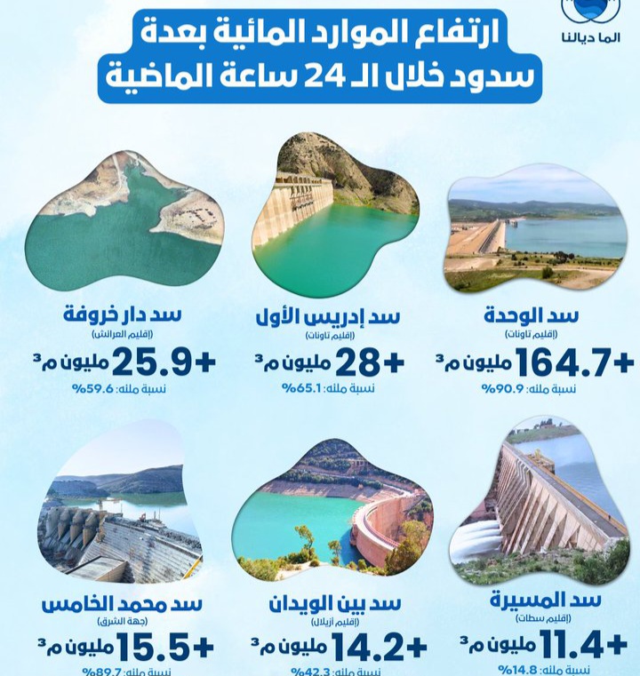 وتعكس هذه المعطيات الأثر الإيجابي للواردات المائية المسجلة، بما يساهم في دعم المخزون المائي وتحسين وضعية الموارد المائية بعدد من سدود المملكة.