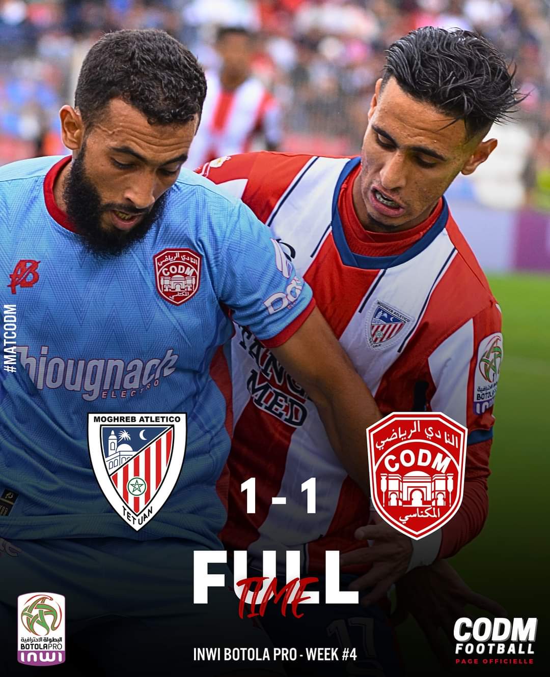 برسم الجولة الرابعة رحل الكوديم نحو مدينة الحمامة البيضاء، لمواجهة فريقها المحلي المغرب الرياضي التطواني. مباراة ذات الرهانات المشتركة بين الفريقين، وبنفس وضعيات أزمة النتائج (لم يتذوقا طعم الانتصار) إلى حدود الدورة الرابعة (4). فريق المغرب الرياضي التطواني استقبل سبعة (7) انتدابات، وكان الحديث عن (14) من اللاعبين الذين غادروا الفريق، لكن بقيت هنالك بصمة هوية الفريق الأول حاضرة، واللحمة بين اللاعبين موجودة، والتي تم ترتيبها بالتجديد. فيما الكوديم، فالمشكلة الأساس كانت في كثرة الانتدابات (مول الانتدابات)، وفي غياب بناء الانسجام (الفريق التقني)