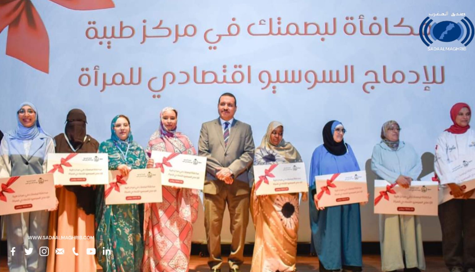 نظمت جمعية طيبة للأعمال الإجتماعية بمدينة الداخلة مساء يوم الأربعاء 13 نونبر الجاري، فعاليات الحفل الختامي لدورة الأربعين للملتقى الوطني للأسرة، بتنسيق مع مؤسسة التعاون الوطني والمديرية الجهوية لقطاع الثقافة بجهة الداخلة وادي الذهب، تحت عنوان “التمكين الإقتصادي للمرأة آلية لتعزيز مرتكزات الدولة الإجتماعية”.