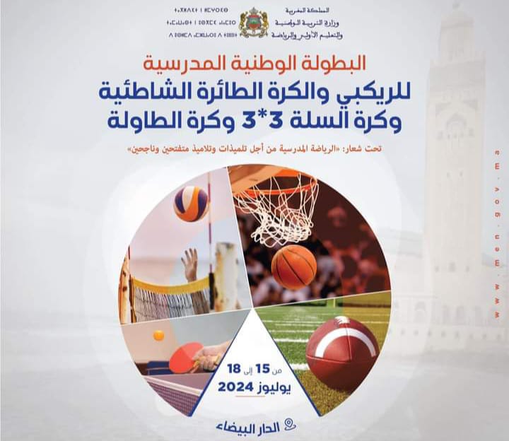 تنظم وزارة التربية الوطنية والتعليم الأولي والرياضة، بمدينة الدار البيضاء، كلا من البطولة الوطنية للريكبي والكرة الطائرة الشاطئية وكرة السلة 3*3 وكرة الطاولة بتعاون مع الجامعة الملكية المغربية للرياضة المدرسية والأكاديمية الجهوية للتربية والتكوين للدارالبيضاء سطات، وذلك خلال الفترة الممتدة بين 15 و18 يوليوز 2024.