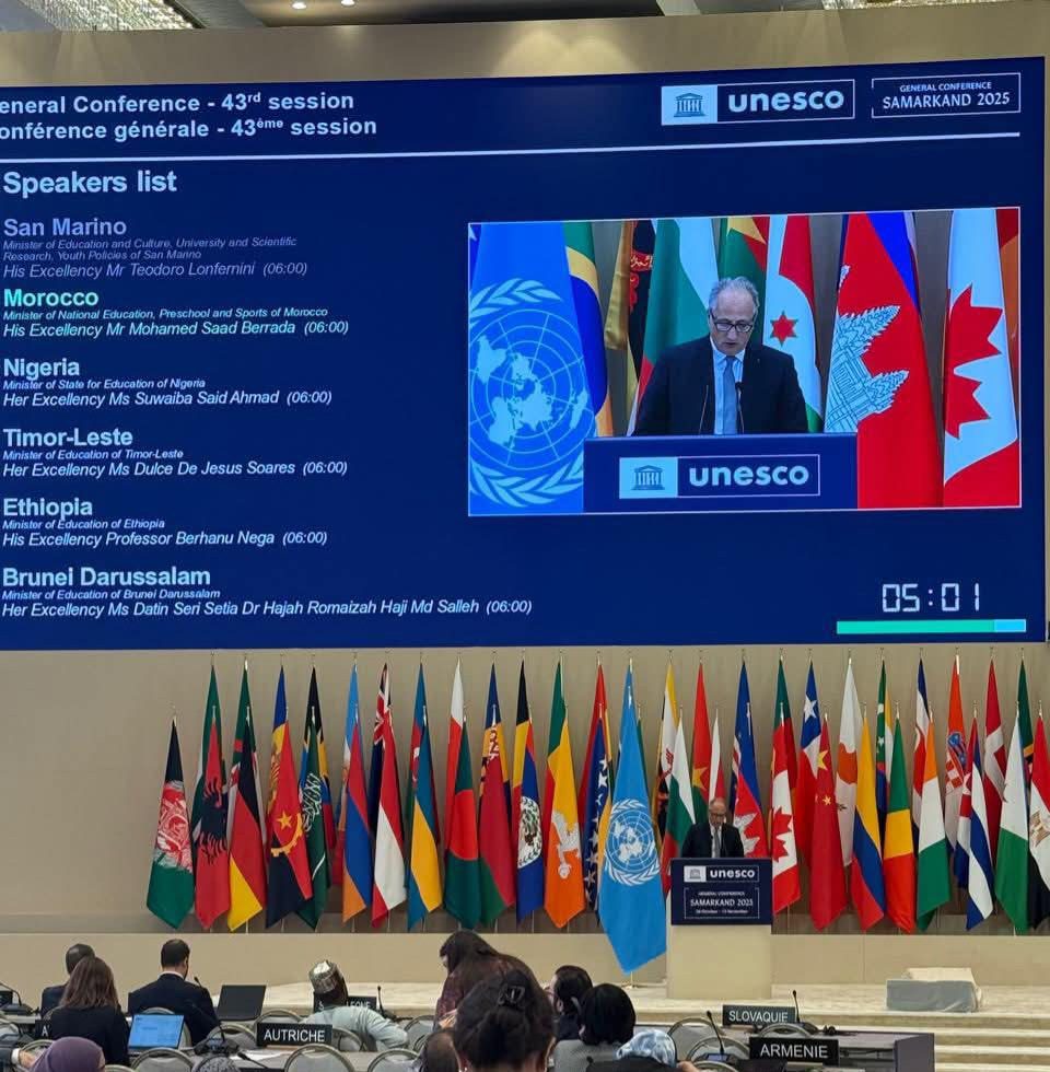 ألقى السيد محمد سعد برادة، وزير التربية الوطنية والتعليم الأولي والرياضة، رئيس اللجنة الوطنية للتربية والعلوم والثقافة،أمس الجمعة 31 أكتوبر 2025، بسمرقند إعلان المملكة المغربية خلال الجلسة المخصصة لمناقشة السياسة العامة، في إطار أشغال الدورة الثالثة والأربعين للمؤتمر العام لمنظمة الأمم المتحدة للتربية والعلم والثقافة (اليونسكو)، و ذلك بحضور السيد محمد عادل امبارش، سفير المملكة المغربية في أذربيجان وأوزباكستان، و السيد سمير الظهر المندوب الدائم للمملكة المغربية لدى اليونسكو و باقي أعضاء الوفد المغربي.