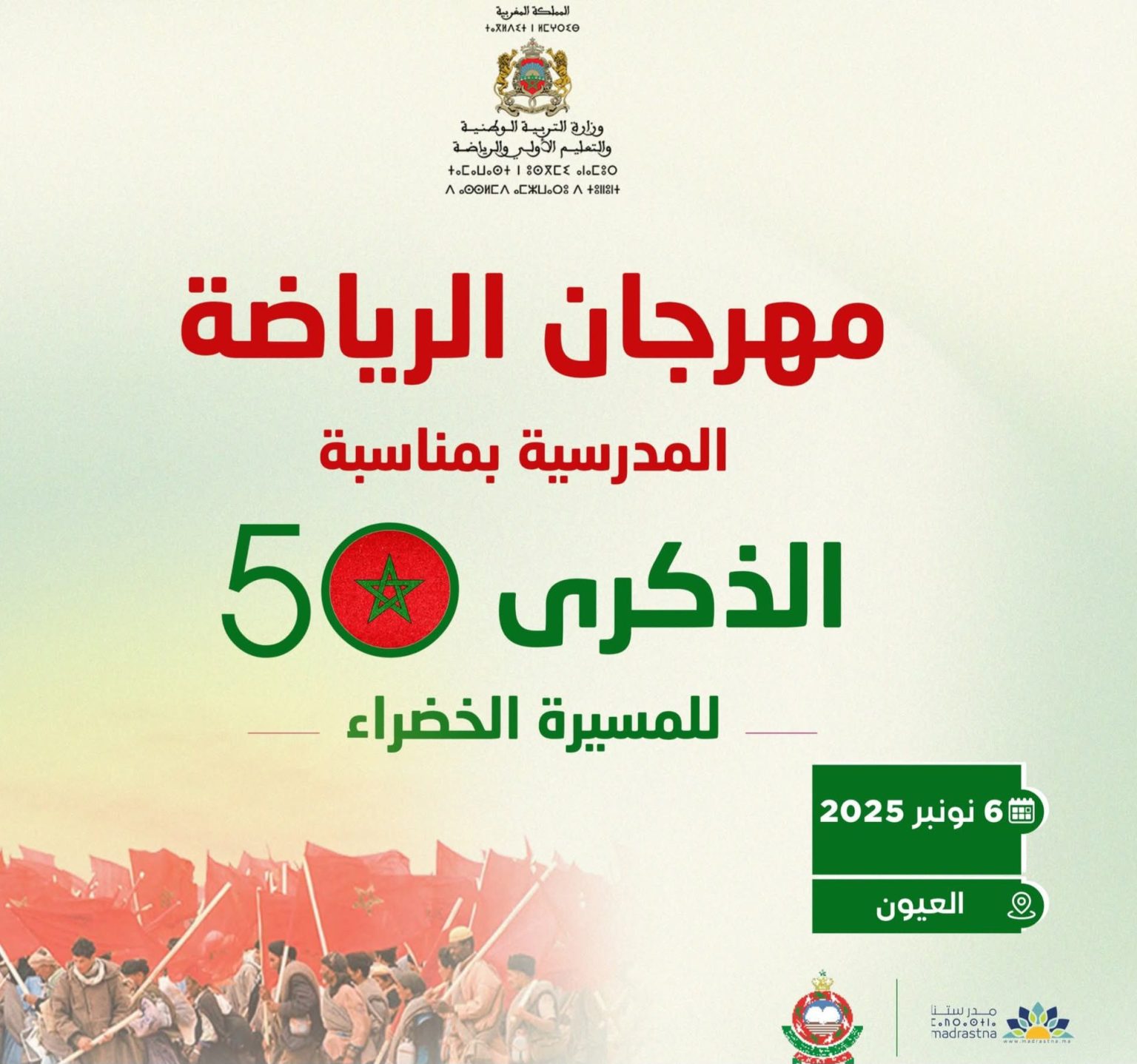 تخليداً للذكرى الخمسين للمسيرة الخضراء المظفرة، تنظم وزارة التربية الوطنية والتعليم الأولي والرياضة، بشراكة مع الجامعة الملكية المغربية للرياضة المدرسية، وبتنسيق مع الأكاديمية الجهوية للتربية والتكوين لجهة العيون الساقية الحمراء، مهرجان الرياضة المدرسية بمدينة العيون، يوم الخميس 6 نونبر 2025، تحت شعار: “الرياضة المدرسية في خدمة القيم الوطنية”.