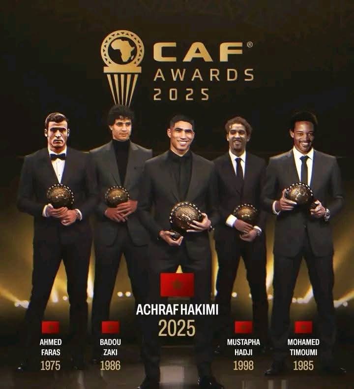 أحرز الدولي المغربي و نجم باريس سان جيرمان أشرف حكيمي جائزة الكرة الذهبية لأفضل لاعب إفريقي سنة 2025، في حفل بهيج نظمه الاتحاد الافريقي لكرة القدم مساء يوم الأربعاء 19 نونبر 2015 بالعاصمة الرباط وسط حضور عدة شخصيات رياضية وازنة يتقدمها رئيس الفيفا جاني إنفانتينو،و رئيس الكاف الدكتور باتريس موتسيبي،بالإضافة لرئيس الجامعة الملكية المغربية لكرة القدم السيد فوزي لقجع إلخ…،و تفوق النجم المغربي على لاعب ليفربول المصري محمد صلاح و هداف غلطة سراي التركي النيجيري فيكتور أوسيمين.