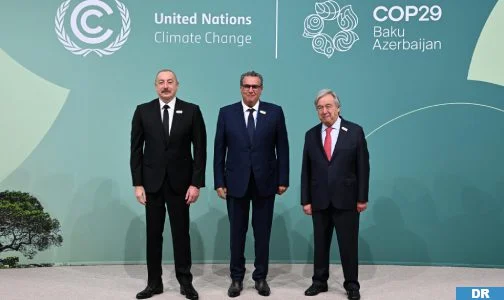 استقبل رئيس جمهورية أذربيجان، إلهام علييف، والأمين العام للأمم المتحدة، أنطونيو غوتيريش، اليوم الثلاثاء بالملعب الأولمبي في باكو، رئيس الحكومة عزيز أخنوش، الذي يترأس الوفد المغربي المشارك في الدورة التاسعة والعشرين لمؤتمر الأطراف في اتفاقية الأمم المتحدة الإطارية بشأن تغير المناخ (كوب 29) المنعقدة بأذربيجان.
