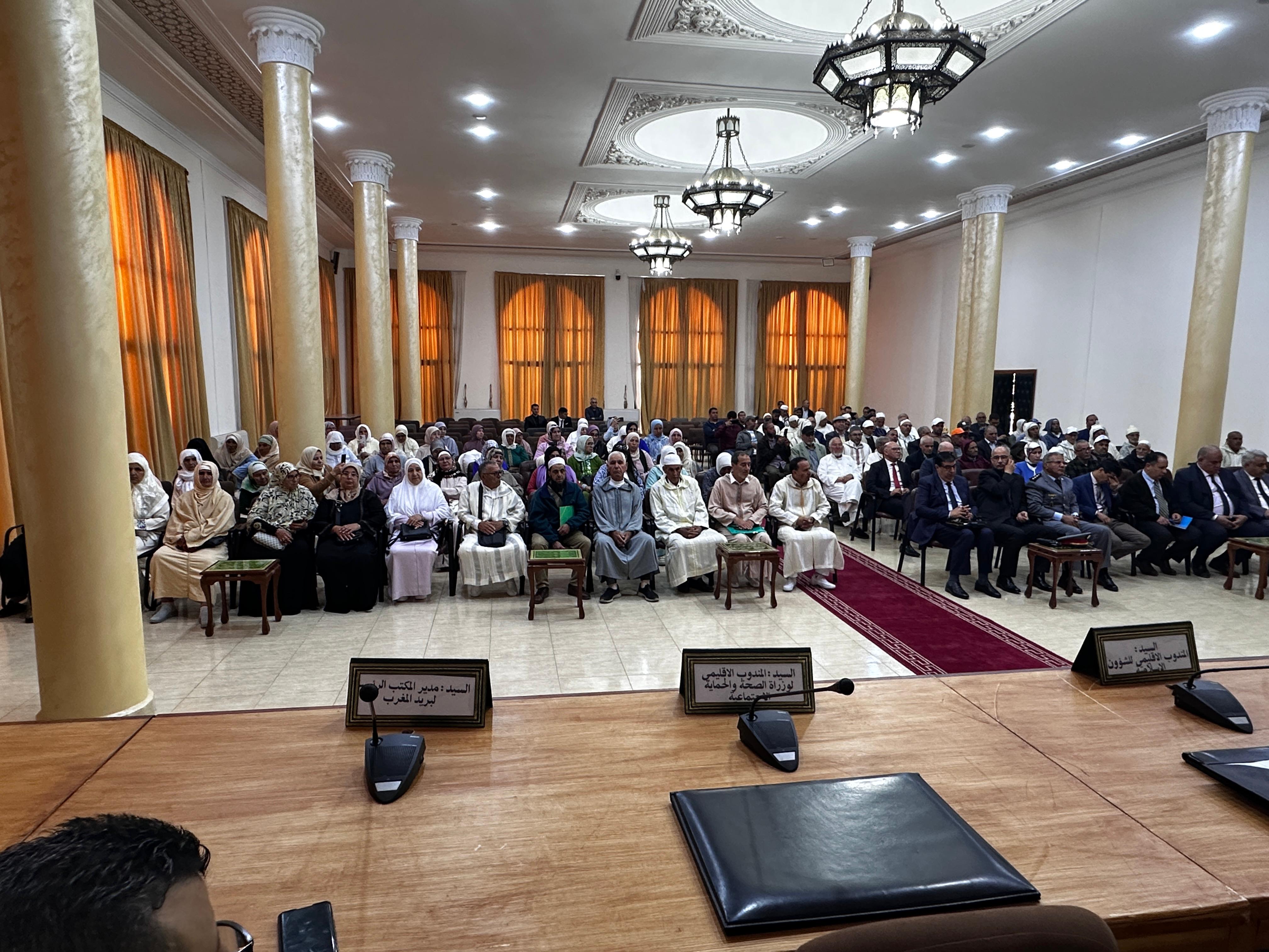 ترأس السيد عامل إقليم تاونات يوم الإثنين 14 ذو القعدة 1446 هــ ، الموافق ل 12 ماي 2025 بمقر ملحقة عمالة الإقليم حفل توديع الحجاج الميامين المنتمين للإقليم والمتوجهين إلى الديار المقدسة لأداء مناسك الحج برسم سنة 1446 هـ ، بحضور كل من رئيس المجلس العلمي المحلي ورؤساء المصالح الأمنية الإقليمية والمندوب الإقليمي للشؤون الإسلامية والباشوات ورؤساء الدوائر ومدير وكالة البريد بنك والمندوب الإقليمي لوزارة الصحة والحماية الاجتماعية بالنيابة.