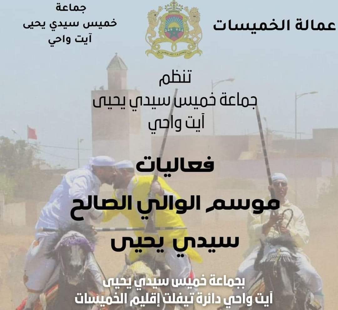 تحت شعار: “إرث أجدادنا فخر وإعتزاز لثقافتنا”، تحتضن الجماعة الترابية خميس سيدي يحيى “أيت واحي” دائرة تيفلت بإقليم الخميسات، من 19 إلى 22 شتنبر 2024، فعاليات موسم الوالي سيدي يحيى للتبوريدة من تنظيم الجماعة الترابية خميس سيدي يحيى، وذلك في إطار الأنشطة الثقافية والترفيهية التي تعمل الجماعة من أجل إنجاحها وخلق متنفس يليق بسكانها.