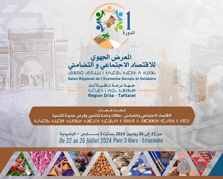 ينظم مجلس جهة درعة تافيلالت، تخليدا للذكرى الـخامسة والعشرين لاعتلاء جلالة الملك محمد السادس عرش أسلافه الميامين، الدورة الأولى للمعرض الجهوي للاقتصاد الاجتماعي والتضامني بجهة درعة تافيلالت، بشراكة مع وزارة السياحة والصناعة التقليدية والاقتصاد الاجتماعي والتضامني وولاية جهة درعة تافيلالت، تحت شعار “الاقتصاد الاجتماعي والتضامني .. طاقات واعدة للتثمين وفرص جديدة للتنمية”، وذلك خلال الفترة ما بين 22 و 26 يوليوز 2024، بمنتزه 3 مارس بمدينة الرشيدية.