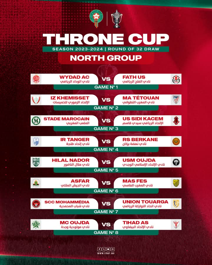 أسفرت قرعة دور سدس عشر كأس العرش للموسم الرياضي 2023-2024، التي أجريت الثلاثاء بسلا، في شطر الشمال عن استقبال اتحاد طنجة ضيفه نهضة بركان.