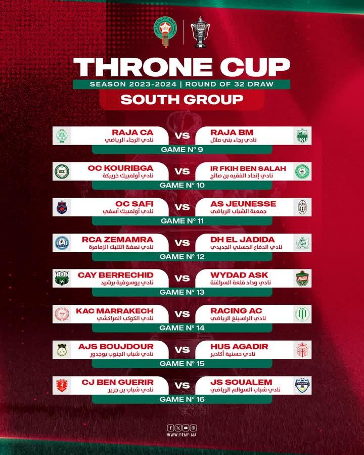 وفي ما يتعلق بشطر الجنوب وعن نفس الدور أسفرت عن مواجهة نهضة الزمامرة لضيفه الدفاع الحسني الجديدي، فيما يستقبل الرجاء الرياضي فريق رجاء بني ملال.