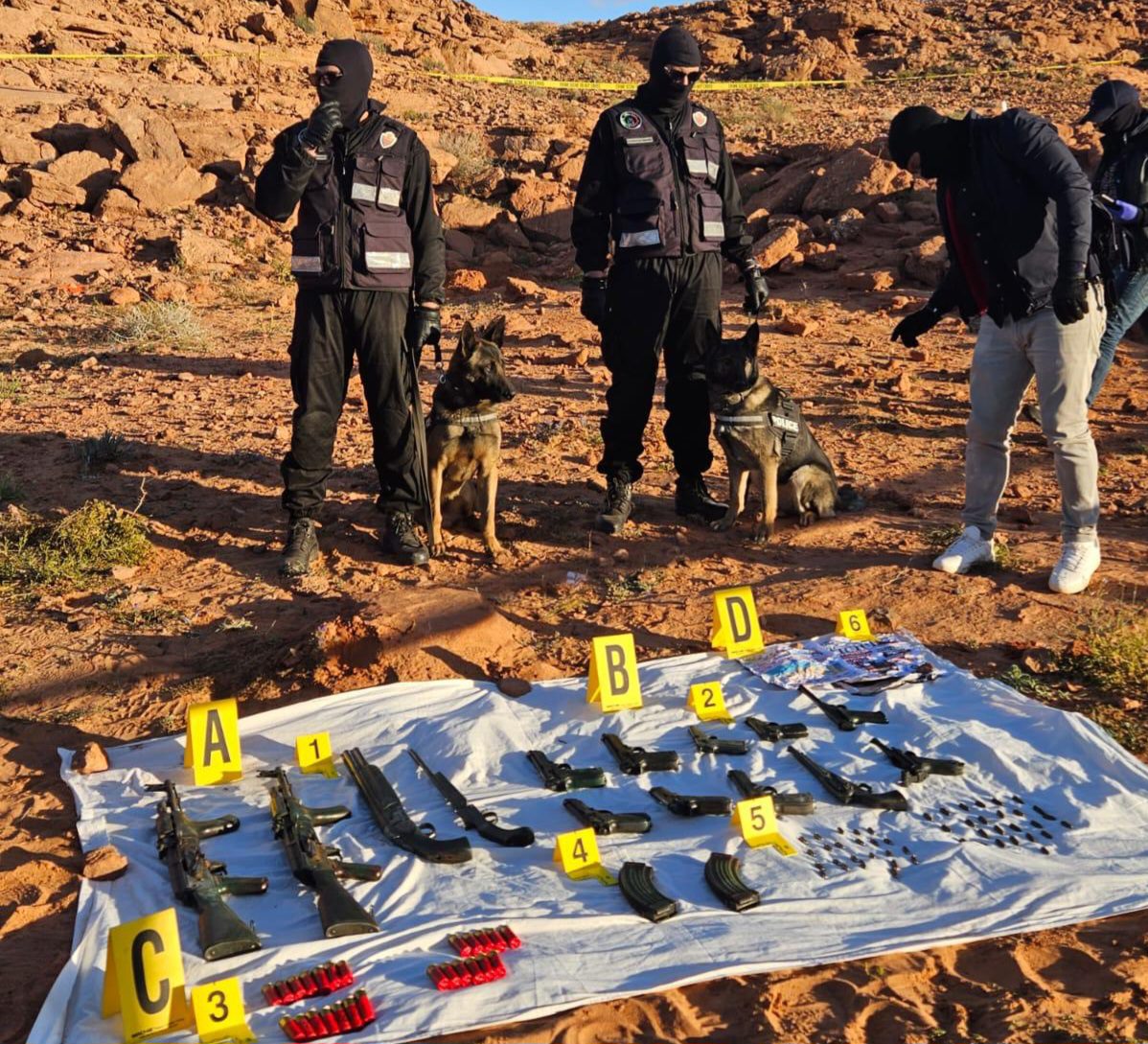 وقد مكنت عمليات التفتيش والتمشيط, التي استغرقت أكثر من ثلاث ساعات تقريبا، من العثور على شحنة من الأسلحة والذخيرة النارية مدفونة في مكان منزو أسفل المرتفع الصخري، كانت ملفوفة في أكياس بلاستيكية وجرائد ورقية منشورة بدولة مالي، من بينها أسبوعيات ورقية صادرة بتاريخ 27 يناير 2025.