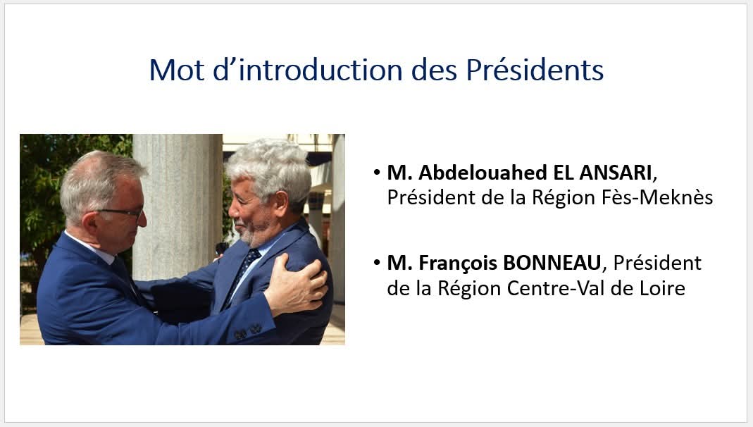 وقد ترأس هذا اللقاء كل من السيد عبد الواحد الأنصاري، رئيس مجلس جهة فاس-مكناس، والسيد فرانسوا بونو، رئيس جهة سونتر-فال دو لوار، بحضور القنصل العام لفرنسا بفاس، وممثلة المديرية العامة للجماعات الترابية، إلى جانب المندوب الجهوي للصناعة التقليدية ومسؤولي مراكز التكوين المتخصصة في مهن الفن بالجهتين.