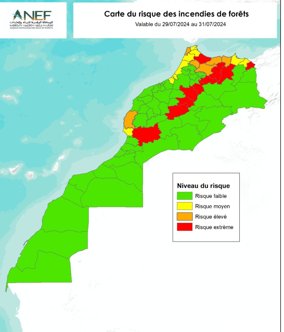 من أجل استباق ظاهرة حرائق الغابات على الصعيد الوطني، تصدر الوكالة الوطنية للمياه والغابات، وبشكل يومي، بناأً على معطيات علمية، خرائط تنبؤ تحدد بدقة المناطق الحساسة والمعرضة لخطر اندلاع الحرائق الغابوية، ابتداأ من يوم الاثنين 29 يوليوز 2024 إلى يوم الاربعاء 31 يوليوز 2024 وبعد تحليل البيانات المتعلقة خصوصا ب: