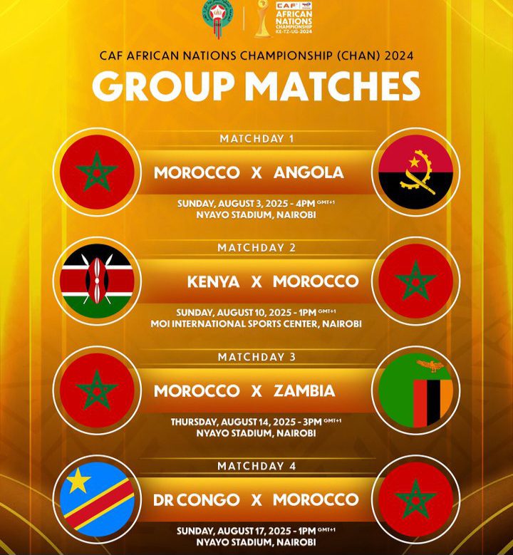 (14:00): المغرب… أنغولا (المجموعة 1)، بالملعب الوطني “نيايو” بنيروبي