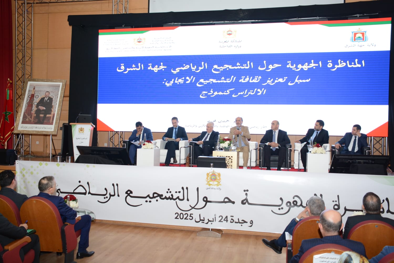 في إطار الدينامية المتواصلة التي يعرفها المشهد الكروي المغربي، وفي انسجام مع الرؤية الرامية إلى جعل الرياضة رافعة استراتيجية للتنمية الشاملة، احتضنت مدينة وجدة يوم الخميس 24 أبريل 2025 مناظرة جهوية حول التشجيع الرياضي، جمعت عمال أقاليم جهة الشرق، رئيس مجلس جهة الشرق، نخبة من ممثلي الهيآت القضائية، النواب البرلمانيون، رؤساء المصالح الأمنية، رؤساء المجالس المنتخبة، رؤساء المصالح اللاممركزة، رؤساء الفرق الرياضية، رؤساء الجمعيات الرياضية، الكاتب العام للجامعة الملكية المغربية لكرة القدم إضافة إلى خبراء وأطر أكاديمية في مجالات متعددة فضلاً عن مكونات المجتمع المدني.