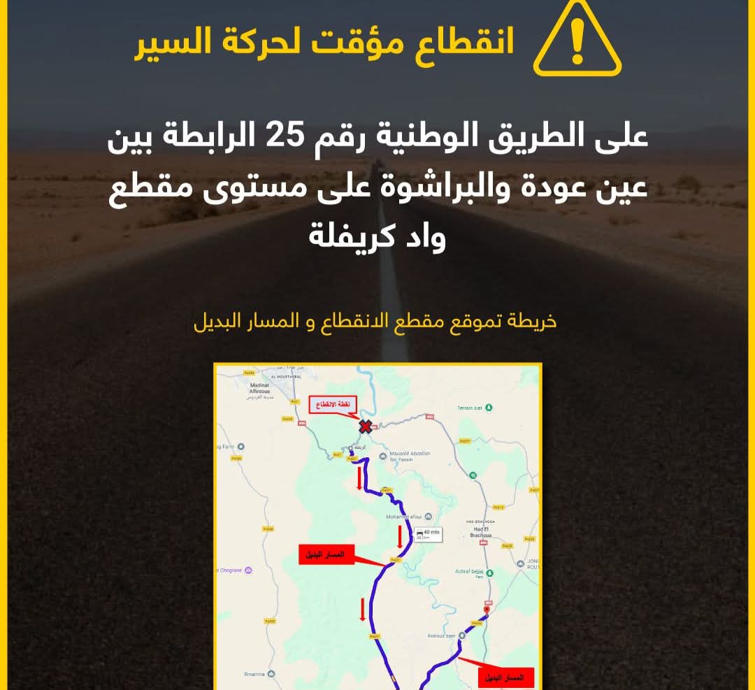تنهي وزارة التجهيز والماء، إلى مستعملي الطريق أن حركة السير مقطوعة مؤقتا بالطريق الوطنية رقم 25 الرابطة بين عين عودة وجماعة البراشوة على مستوى واد كريفلة، نتيجة لارتفاع منسوب المياه الذي أدى إلى غمر قارعة الطريق.