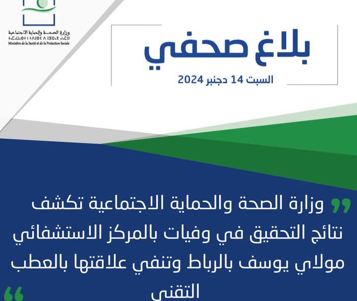 كشفت وزارة الصحة والحماية الاجتماعية، اليوم السبت، عن نتائج التحقيق في وفيات بالمركز الاستشفائي مولاي يوسف بالرباط، نافية علاقتها بعطب تقني.